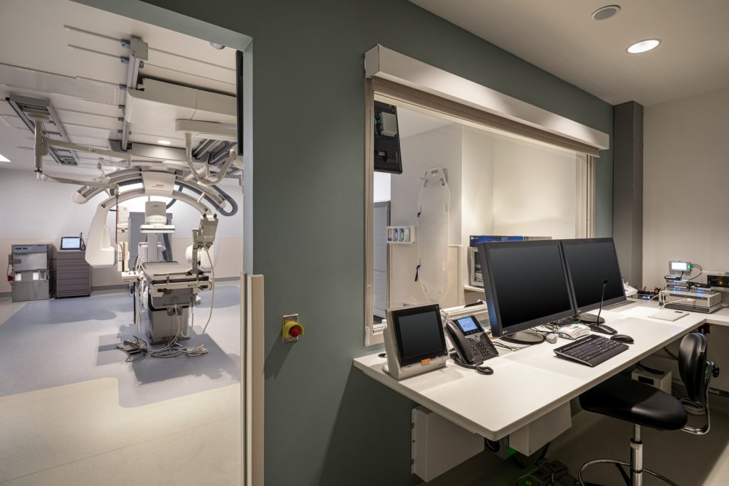 Because the building will ultimately interface with a new outpatient center in another location on the campus, the main reception desk on the ground floor is situated in a corner and is approachable from two directions to accommodate both present and future conditions. Organic design elements in the flooring and ceiling subconsciously pull patients through the elevator lobby rather than signify it as a stopping point.